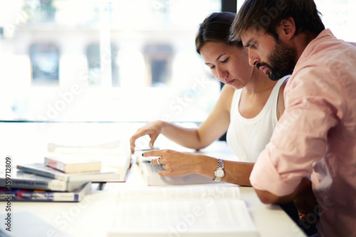 Side view shot with two young students learn together in modern library, couple of university students focused read book while preparing for exams, teenagers sit at the desk with open books