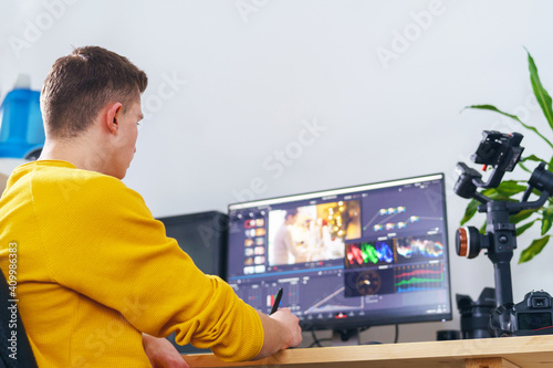 Side view, the guy-videographer using a pen-tablet and a special program makes video processing on the front computer at home. Video editing. Blogging. Freelancer. Remote work. Retouching training