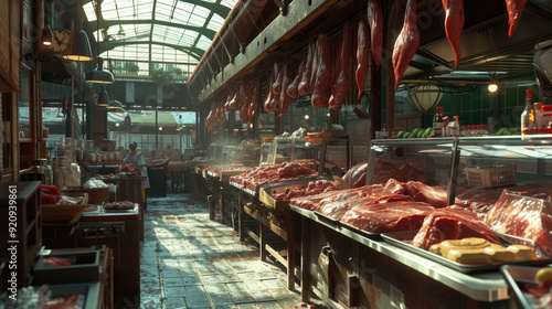 Sideview of a stylish butcher shop and its fridge counter with meat