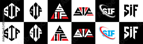 SIF letter logo design in six style. SIF polygon, circle, triangle, hexagon, flat and simple style with black and white color variation letter logo set in one artboard. SIF minimalist and classic logo