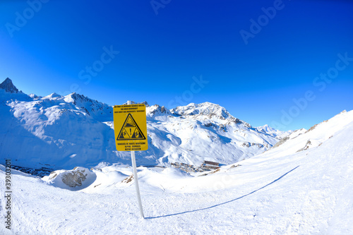 Sign board at High mountains under snow in the winter