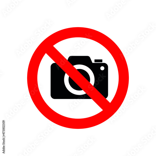 Sign prohibiting photography. Camera icon. You cannot take photographs. Round sticker with a red outline and a diagonal red line through it. Isolated vector illustration on white background.