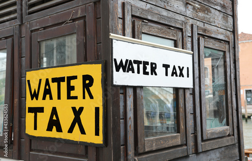 Sign with the inscription WATER TAXI which are the special boats for the transport of people in the city of Venice