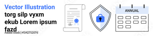 Signed document, shield with lock icon, and annual calendar represent security, contract validity, and periodic updates. Ideal for legal, compliance, data privacy, cybersecurity annual planning