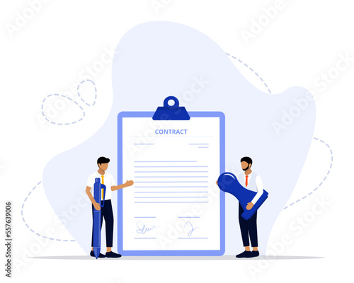 Signing a contract concept illustration. Hand signed document. Signing the contract. Agreement with signature and stamp.