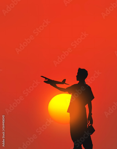 Silhouette, a young man, enjoys learning. With flying small planes and backgrounds in the bigger sun