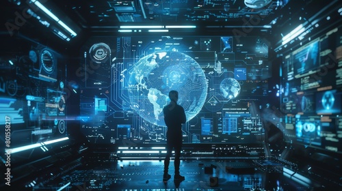 Silhouette Against the Data Sphere: A Human Form Engulfed by a World of Digital Information