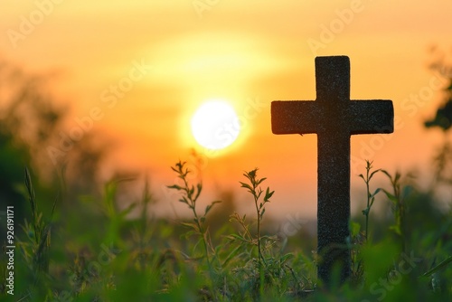 Silhouette christian cross on grass in sunrise background , ai