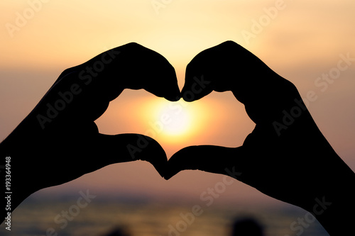 Silhouette hand in heart shape with sunrise in the middle and beach .as background Valentine concept with copy spaces for your text or design.