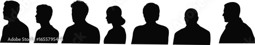 Silhouette head profiles, diverse people, black and white vector, side and front view, group illustration, human faces, professional concept
