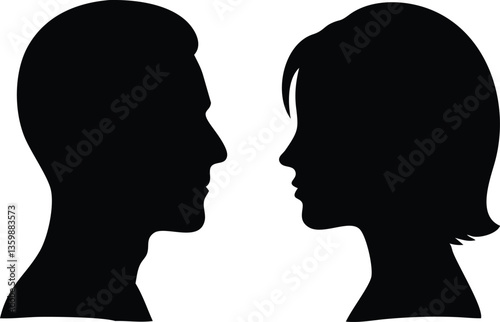 Silhouette Heads Facing Each Other, Man and Woman Profiles, Black and White