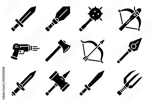 Silhouette icons of medieval and modern weapons on white background