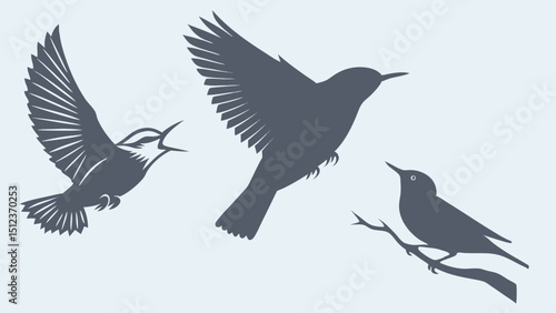 Silhouette illustration of three birds in different poses flying and perched on a branch design