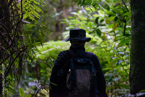 Silhouette image of a man walking in the forest. Framed by fern trees. Rotorua. New Zealand.