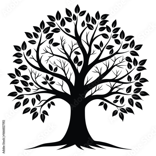Silhouette Image of a Tree with Full Canopy, Showing Branches, Trunk and Roots
