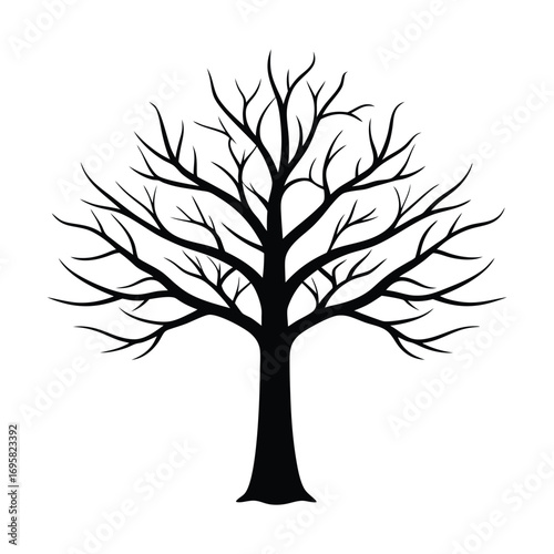 Silhouette of a bare deciduous tree with intricate branches reaching outwards against a clean backdrop