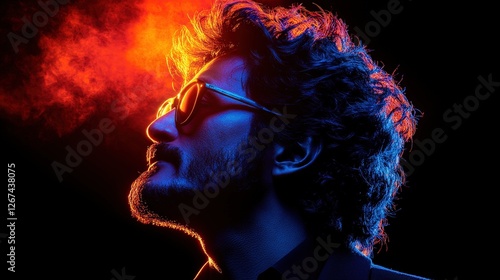 Silhouette of a bearded man with studio lighting against a natural background in high fidelity detail