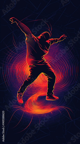 Silhouette of a breakdancer in a frozen pose with sound waves emitting, flat vector design . Bold solid colors clean outlines