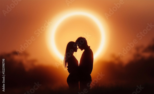 Silhouette of a couple facing each other during sunset, sharing a romantic moment.