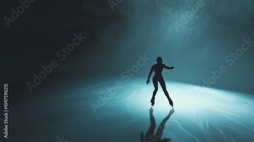 Silhouette of a figure ice skating on a frozen lake under a dramatic, moody sky.