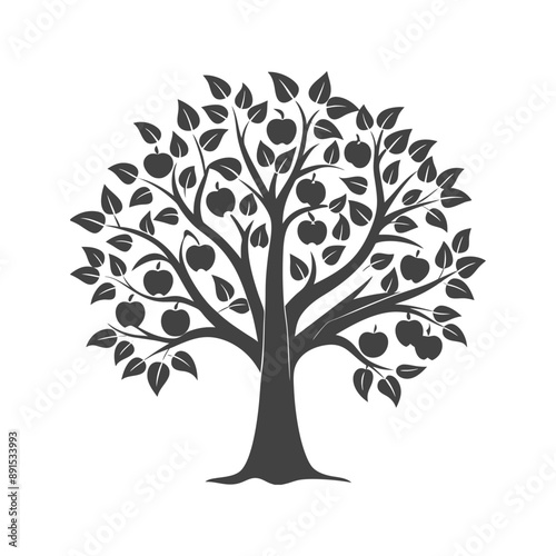 Silhouette of a fruit tree with apples isolated on a white background. Black and white illustration, sketch, design element