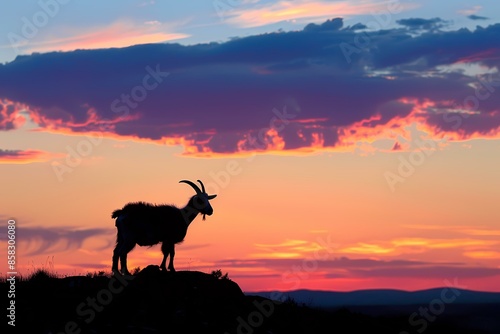 Silhouette of a goat standing on a hilltop at sunset with a colorful sky.
