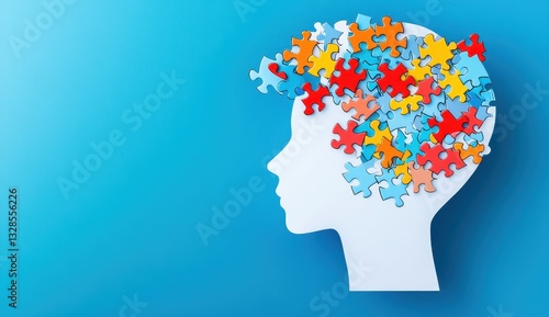 Silhouette of a head filled with colorful jigsaw puzzle pieces on a blue background.