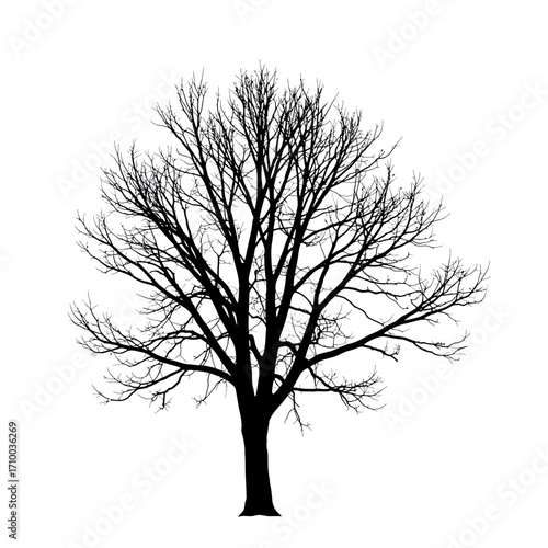 Silhouette of a large bare deciduous tree with intricate branches against a white background