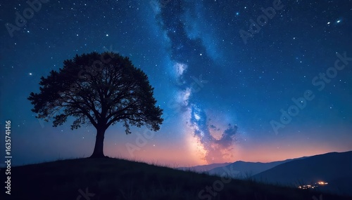 Silhouette of a lone tree against a star-filled night sky, conveying a sense of peace and spiritual reflection Perfect for meditation, yoga, or spiritual themes , nature, energy