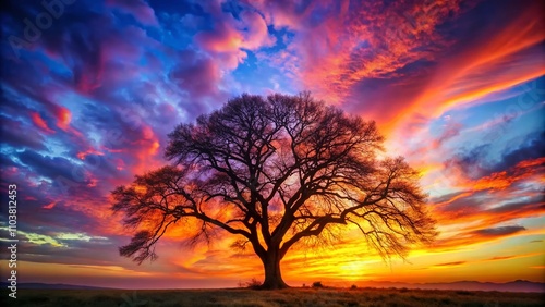 Silhouette of a Majestic Tree with Wispy Smoke Rising Against a Vibrant Sunset Sky, Capturing Nature's Beauty in a Stunning Portrait Photography Scene