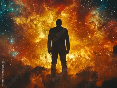 Silhouette of a man against cosmic explosion space environment digital art starry background inspirational concept