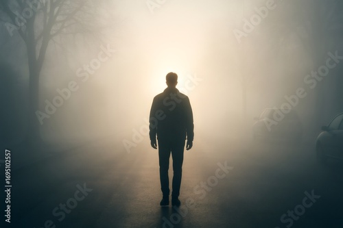 Silhouette of a man standing in a misty road, looking towards a bright light, with cars parked on the side
