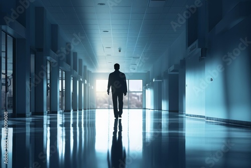Silhouette of a man walking down a hallway with reflective floor, bathed in natural light from windows.