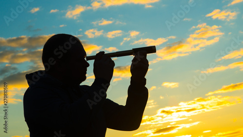 Silhouette of a man with a spyglass on the background of a dramatic sky in the sunset. Conceptt look at the future, pry, travel