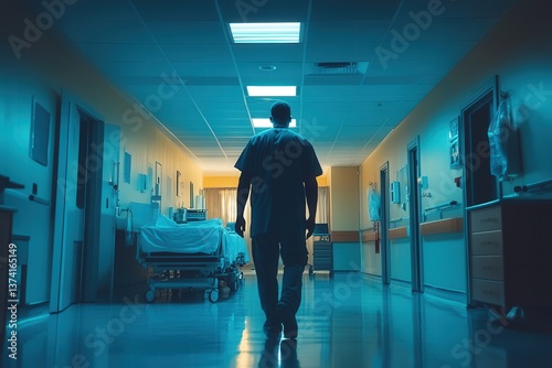 Silhouette of a medical professional, walking down a dimly lit hospital corridor at night.