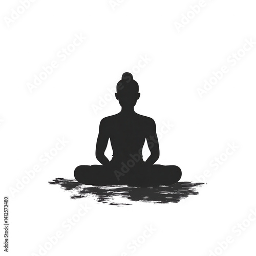 Silhouette of a meditating figure in a serene pose, representing mindfulness and tranquility, set against a white isolated background.