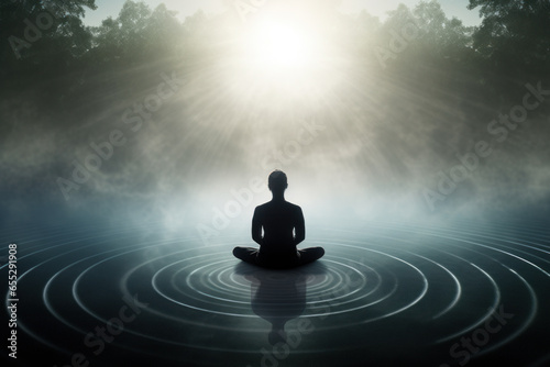 Silhouette of a meditating man in the middle of a lake.