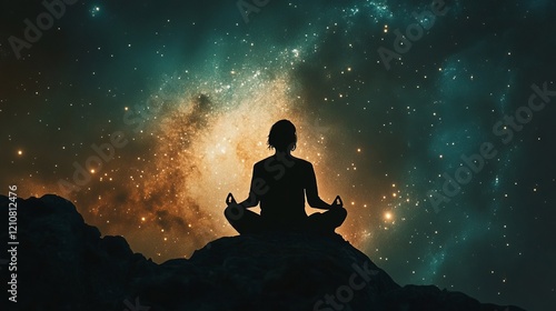 Silhouette of a meditating person against a cosmic galaxy background, ethereal and peaceful, spiritual and serene, high resolution