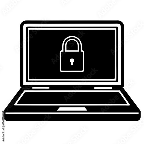 Silhouette of a modern laptop, open and facing forward, with a prominent cybersecurity lock icon displayed on its screen