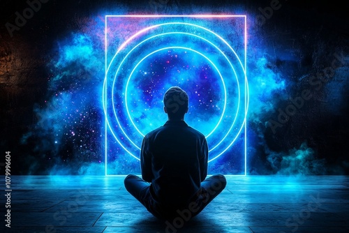 Silhouette of a Person Gazing into an Abstract Cosmic Background with Glowing Circles and Mystical Clouds Highlighting a Sense of Wonder and Exploration