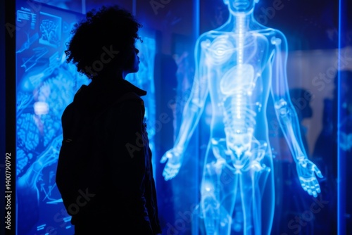 silhouette of a person in a blue background looking at a blue light hologram of a body in a display