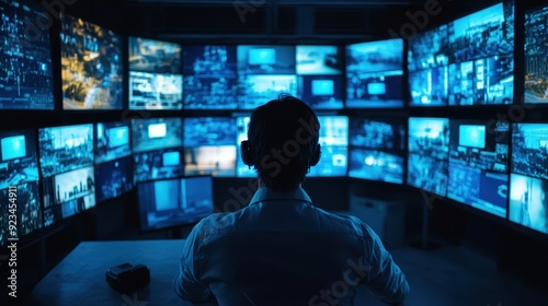 Silhouette of a Person in Front of a Wall of Monitors Showing Data and Security Footage