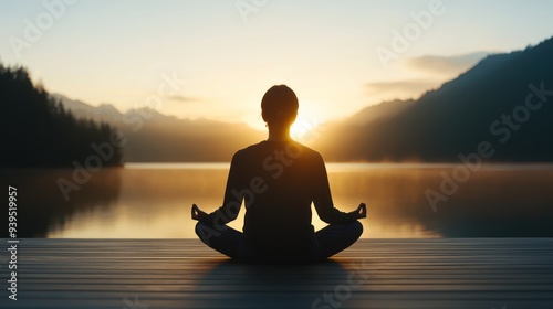 Silhouette of a person meditating at sunrise by a serene lake, embodying tranquility and the essence of mindfulness.
