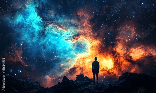 Silhouette of a person standing against a vibrant nebula and starry space background landscape view