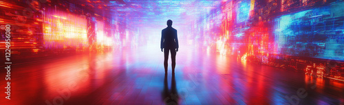Silhouette of a person standing in a neon-lit digital corridor.
