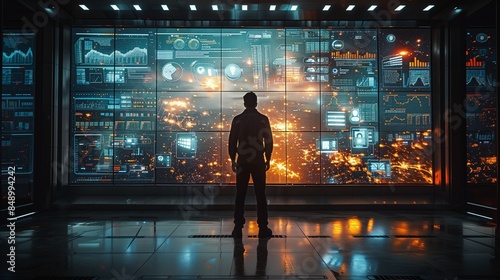 Silhouette of a Person Standing in Front of a Giant Digital Screen Displaying Flow of Data with Cyber Threats and Vulnerabilities