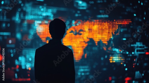 Silhouette of a person standing in front of a world map with glowing data points.