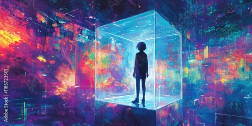 silhouette of a person standing inside a clear glass cube, surrounded by abstract shapes and vibrant colors