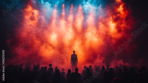 Silhouette of a person standing on stage in front of a large crowd with dramatic lighting and smoke.