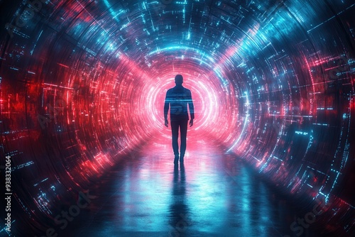Silhouette of a person walking through a futuristic neon-lit tunnel with vibrant red and blue digital lights, symbolizing technology and advancement.